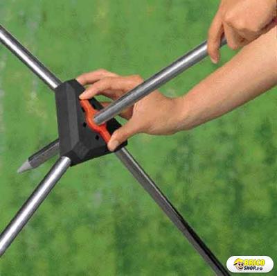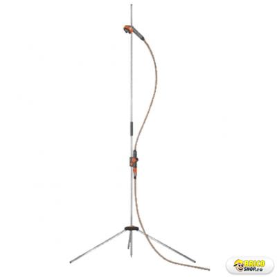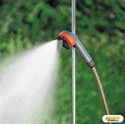 Pentru a face dus afara la fel de confortabil ca in casa. Trepiedul permite montarea oriunde in gradina. Pistol reglabil in inaltime prevazut cu 1.3m furtun de conectare. Alegeti fie jetul fin si larg fie cel foarte fin. Inaltime reglabila. Cu robinet de reglare a debitului.