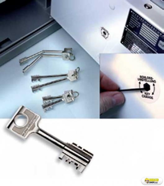 Se livreaza cu 2 chei. Se pot comanda seturi de 2,4 sau 6 chei pe care le puteti seta la broasca dvs. daca ati pierdut o cheie sau nu va sunt suficiente 2 chei.