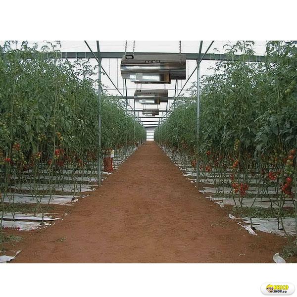 Tunul de aer cald suspendat pe motorina model Calore CYNOX 100F dezvolta o putere calorica de 100kW, un debit de aer 7500mcb/h, un consum motorina 7,9kg/h, alimentare 230V, greutate 135kg.